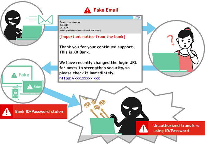 Phishing scam is a fraudulent act in which customers' passwords, PIN numbers, and personal information are obtained illegally by fake emails and websites disguised as real financial institutions, etc., and money is stolen. In most cases, fake emails and websites are cleverly created to look exactly like the real thing, with the email sender, URL, and design.
