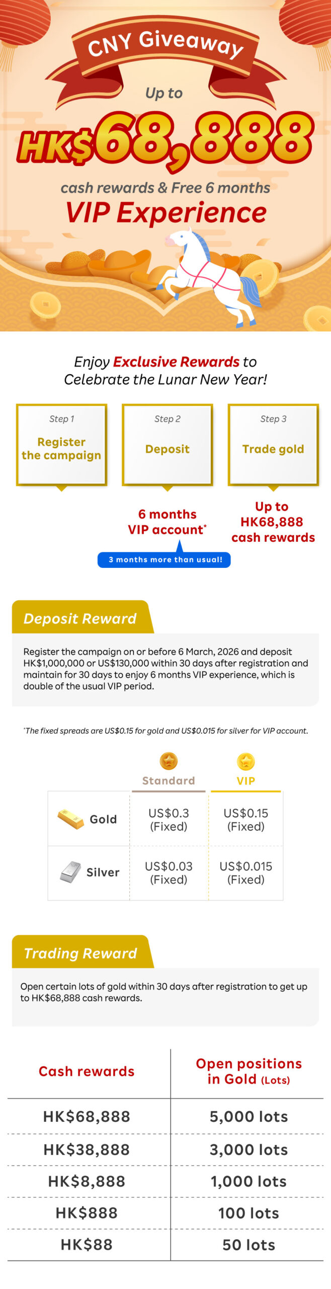6. Eligible Client who opens certain lots of Gold (open only) during the Trading Period shall be eligible to receive the cash rewards listed below (“Trading Reward”):