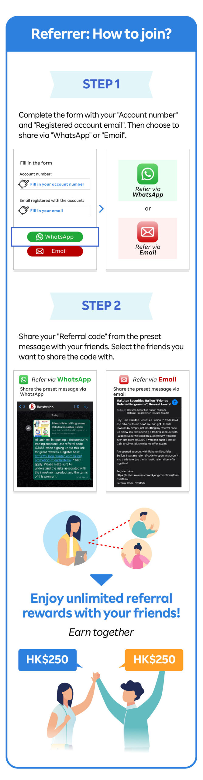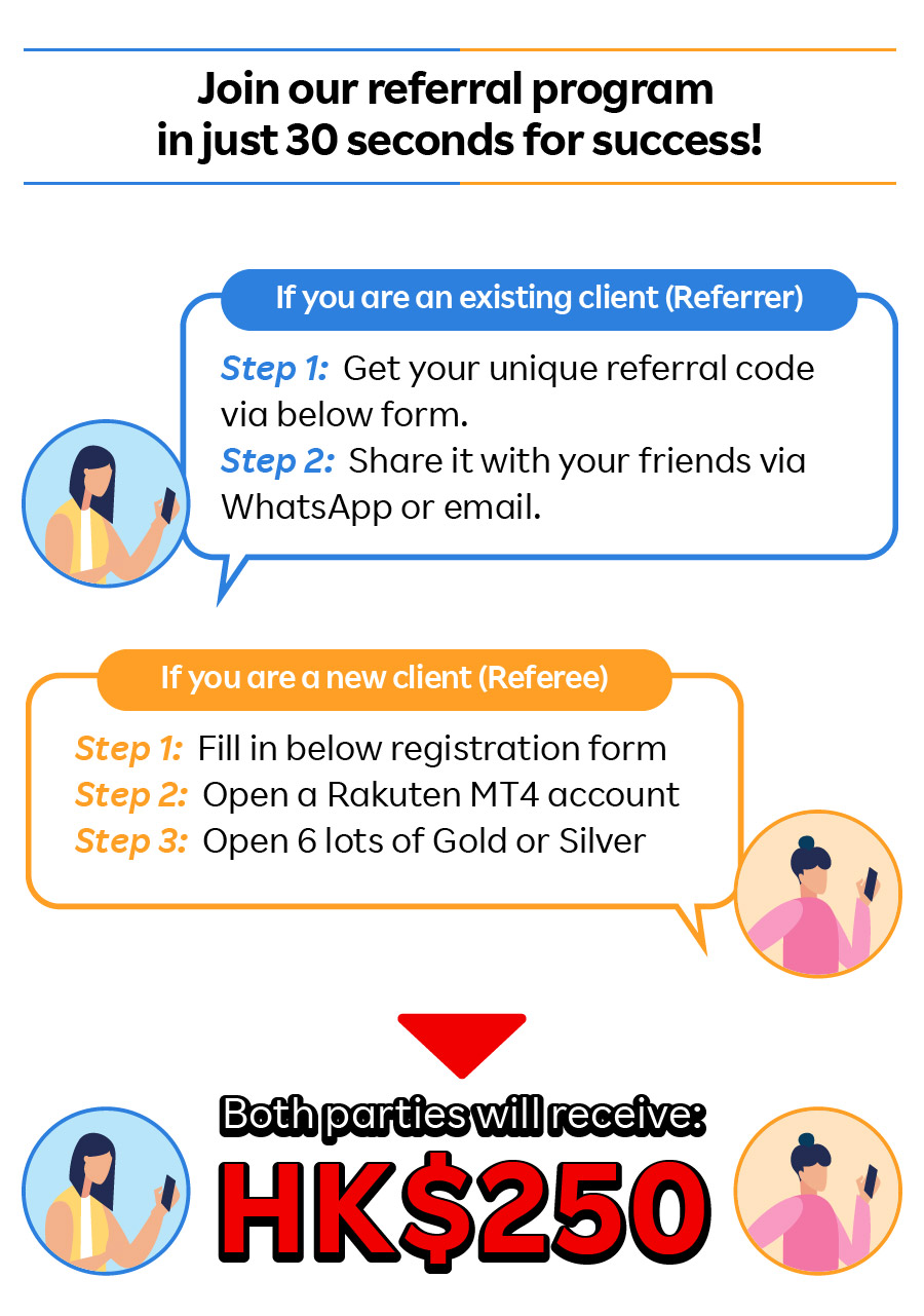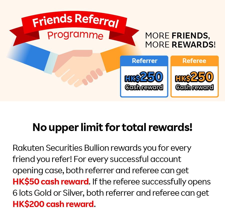 A: The Rakuten Securities Bullion Friends Referral Programme encourages clients to refer more friends and family members to open accounts and trade! When the referee opens an account successfully with a referral code, both referrer and referee can get HK$50. When the referee opens 6 lots of gold or silver, both referrer and referee can get HK$200. There is no upper limit for the rewards.