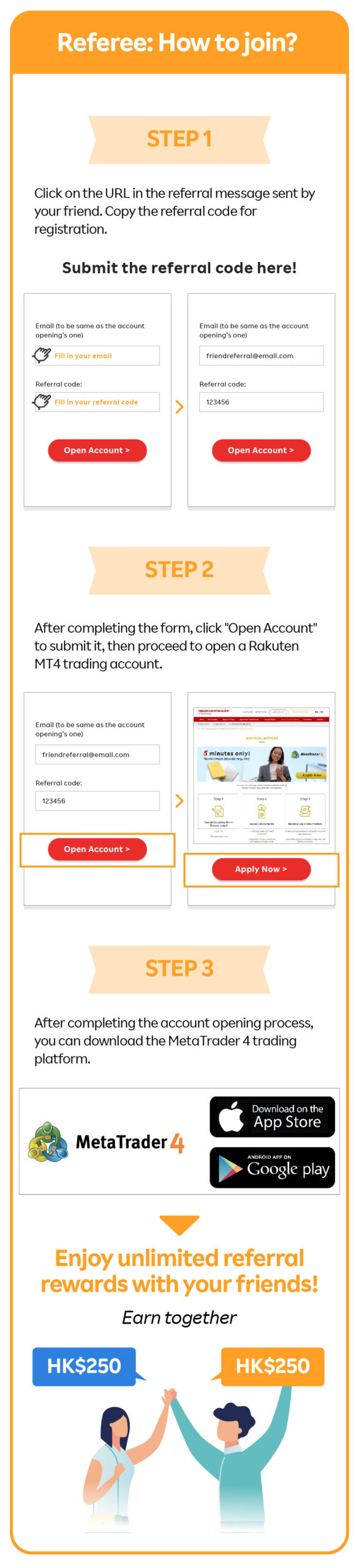 5. For the Referrer and Referee to receive HK$50 cash reward each, the Referee must open a Rakuten MT4 account by submitting the referral code successfully, which is shared by the Referrer, at the designated Programme page . Same email should be used for referral code submission and account opening, otherwise will be deemed as to renounce the reward of The Programme.