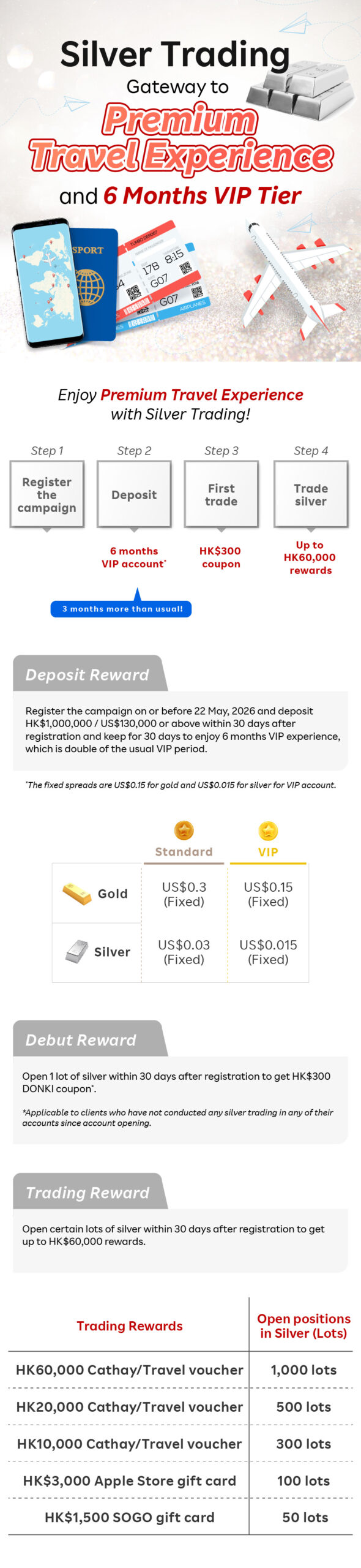 - Eligible Client with no silver trading in any of their accounts since account opening and opens 1 lot or more of Silver within 30 calendar days after the date of registration shall be eligible to receive HK$300 Donki coupon. (“Debut Reward”)