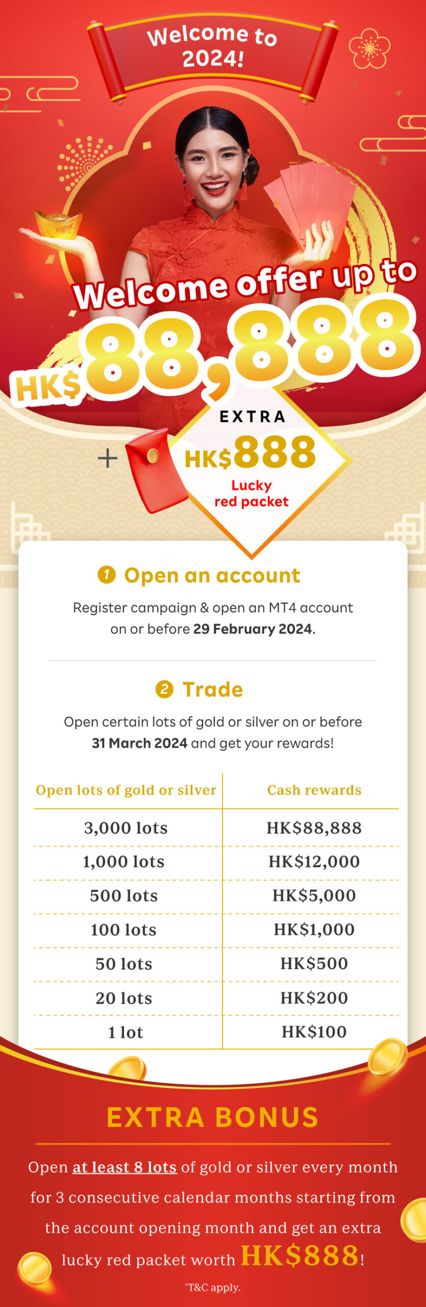 8. Eligible Client who opens 8 lots or more of Gold (800 ounces) or Silver (40,000 ounces) every month for 3 consecutive calendar months starting from the account opening month can receive an extra HK$888 cash reward.