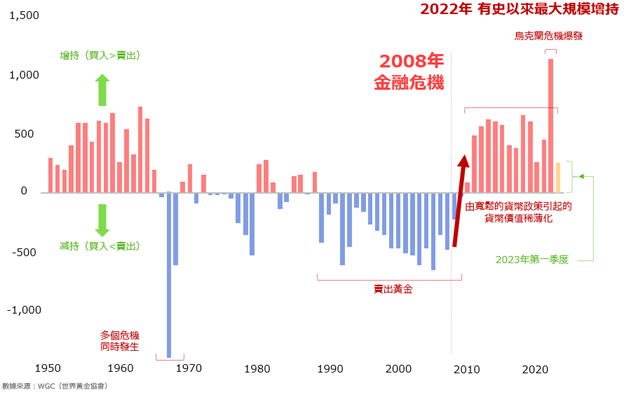 如上圖所示,2022年由於烏克蘭危機爆發和美國迅速加息,增持量達到了記錄中最大的水準。 自2008年發生金融危機以來,各國央行整體上一直在增加黃金儲備。
