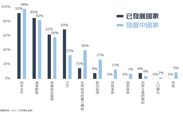 整體上,高度關注的議題包括「歷史地位」、「危機時的表現」、「長期價值/通貨膨脹」、「分散投資組合風險」等。 然而,已發展國家和發展中國家在每個議題上均存在差異。
