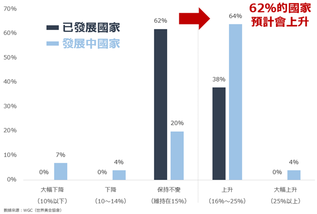 以下是關於黃金(目前持有比例為15%)的內容。 無論是已發展國家還是發展中國家,大多數都表示黃金的持有比例將會上升(共計比例為62%,去年為46%)。