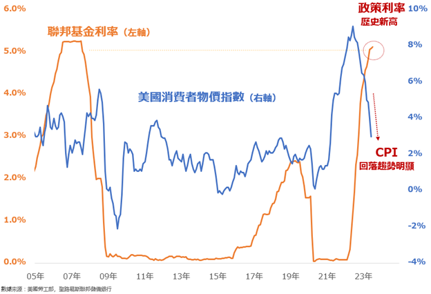 說到這裡再看回上圖(利率和CPI)在2022年連續四次的快速加息後,即使市場中有呼籲降息的聲音,美聯儲也不會立刻停下腳步。