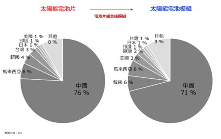 中國佔據了全球矽生產的近70%。這可以歸因於中國在矽原料—矽石的生產量大以及相關加工技術的普及。同時,中國利用這些矽材料生產太陽能電池的電池片(最小單元面板)和模組(由多個電池片組合而成)。
