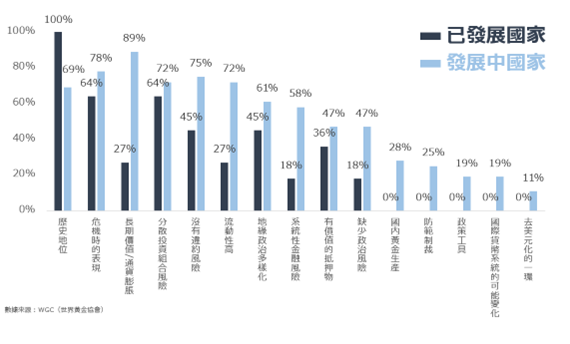 關於「歷史地位」,所有已發展國家的中央銀行(100%)都選擇了這個選項,但只有69%的發展中國家中央銀行選擇了這個選項。此外,除了該選項外,發展中國家的比例在其他選項中超過了已發展國家。發展中國家的中央銀行似乎期望黃金在危機時表現出色,具有長期價值保全和對抗通脹的效果,有助於構建高效的投資組合,並具有高流動性,可以降低政治風險。