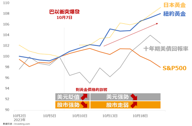 以下是自以色列和加沙地區爆發戰爭以來的黃金、債券以及股票價格走勢。