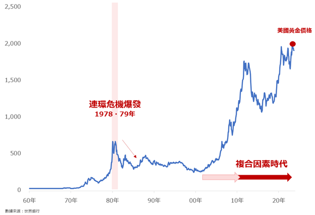 2000年後,儘管世界各地發生了多場戰爭,但金價仍持續上漲的原因是,非危機時期的因素變得更加重要。這些因素包括中央銀行的購買、中國和印度的珠寶業需求,以及長期的重大風險(霸權爭奪、西方和非西方之間的對立)等。2008年金融危機以來,大規模的貨幣寬鬆政策在美國等地實施,導致金價進入了「複合因素時代」。