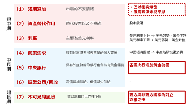 目前突出的「危機情緒」可歸類為短中期的主題。談到影響黃金價格走勢的主題,其影響程度和時間軸也各不相同。特別是對於長綫投資黃金的人來說,更應該關注長期因素。