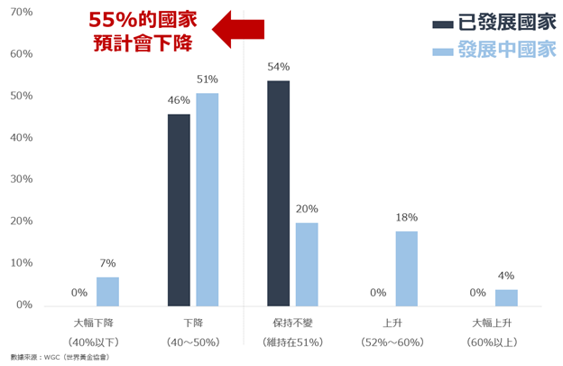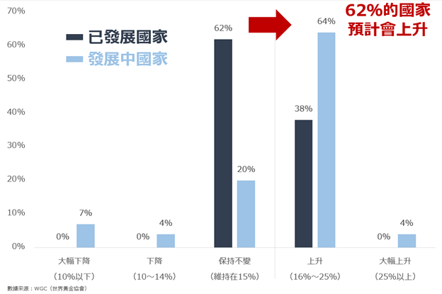 接下來是關於黃金的情況。 無論是已發展國家還是發展中國家,大多數人認為黃金的持有比例將上升。