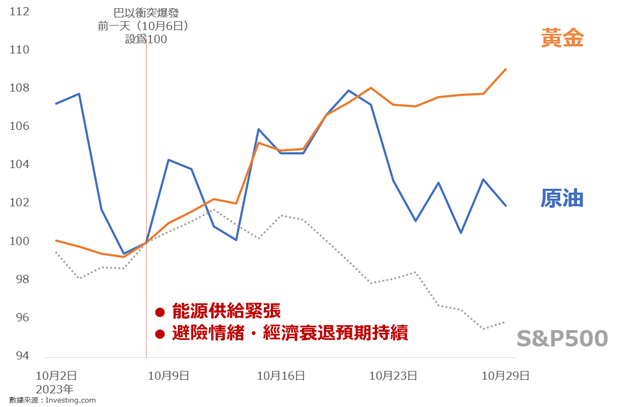 以下是黃金、原油和股價指數(S&P500)在巴以衝突爆發前(10月6日)以100為基準的價格走勢。黃金持續上漲,原油雖然暫時回落但反彈並保持高位,股價指數持續下跌。