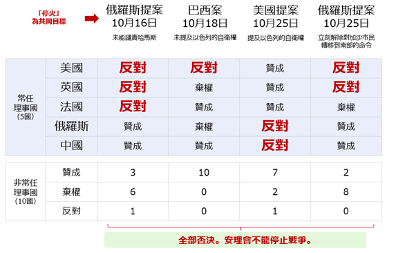 戰爭爆發後,聯合國安全理事會(安理會)進行了四次投票。雖然每個提案都呼籲立即停火和迅速提供人道援助,但全部均未能通過。儘管立即停火和及時提供人道援助是每個人都希望實現的目標,但為什麼這些提案沒有被通過呢?