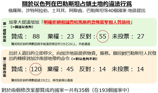 加拿大提出的修正案提到「明確拒絕和譴責哈馬斯的恐怖襲擊和人質劫持」。這個加拿大的提案以88票贊成、23票棄權和55票反對被否決。55個投反對票之國家中有35個來自原始提案的40個國家。(在表決時,會場掌聲如雷)