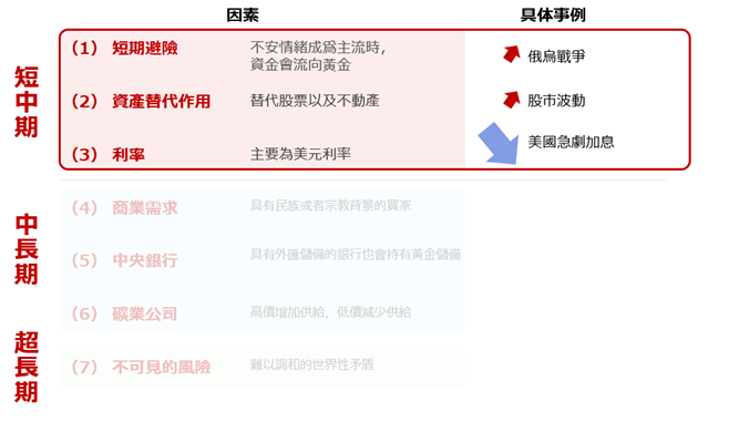 那麼,為什麼2022年的黃金價格沒有按照許多人所熟知的「戰爭爆發=黃金上漲」、「亂世黃金」等過去事件和傳說的走勢呢?答案非常簡單,因為現代的黃金價格不僅僅受到危機情況的影響。如果不同時考慮其他幾個因素,就無法分析現代的黃金價格。