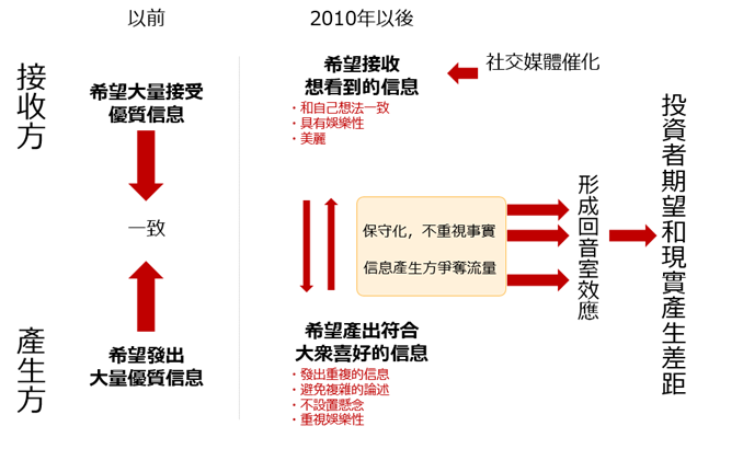 自2010年左右智能手機的全球普及以來,社交媒體和視頻網站開始崛起。信息接收者無意識地比以往更加渴望「看到他們想看到的東西」。在社交媒體上,持有相同觀點的人們積極交換意見;在視頻網站上,根據過去的瀏覽歷史等推薦視頻被顯示出來,使人們隨時都能看到他們想看的東西(這是智能手機上的一種上癮行為)。