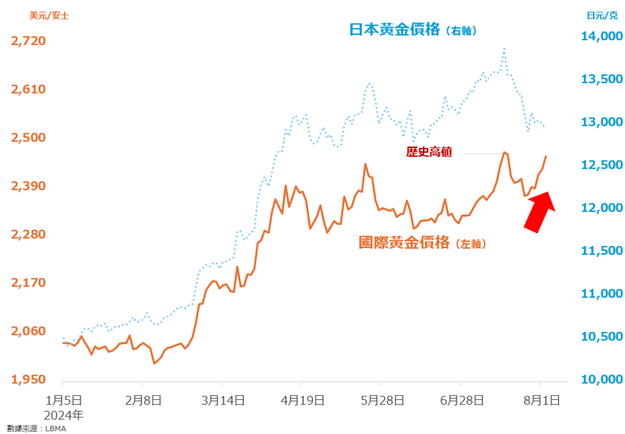 這裡所說的替代資產是指投資股票的替代作用。由於美國和中國接連出現疲軟的經濟指標,以及日本銀行可能進一步加息和由此導致的日元急劇升值引發對日本經濟前景的猜測,多個主要國家的股指變得不穩定。受此影響,過去出現的「股市下跌、黃金上漲」的聯想再次出現,替代資產引發的上漲壓力增強。