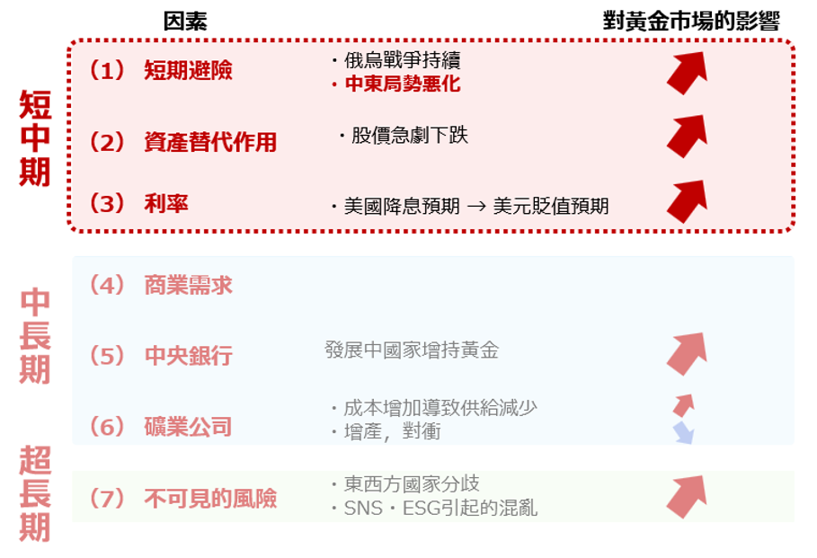 雖然有七個因素,但與近期價格走勢相關的短中期因素有三個:避險情緒、替代資產和利率。避險情緒可以理解為不安情緒擴大時的資金避險需求。近期中東局勢惡化和美國總統大選相關的不安情緒擴大備受關注,由此引發的上漲壓力增強。