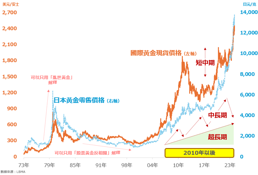 以下圖表顯示了自2010年左右市場環境大幅變化以來,中長期和超長期因素對黃金市場的影響。中長期的因素影響期短則數月,長則數年,而超長期的因素影響期短則數年,長則數十年。