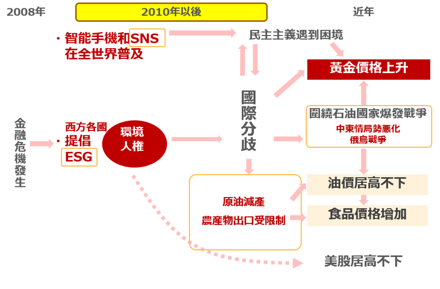 筆者認為,如以下圖表所示,自2010年左右以來,智能手機(包括SNS上的通訊)和ESG概念在全球的普及,成為了加深西方與非西方之間分歧的原因之一。