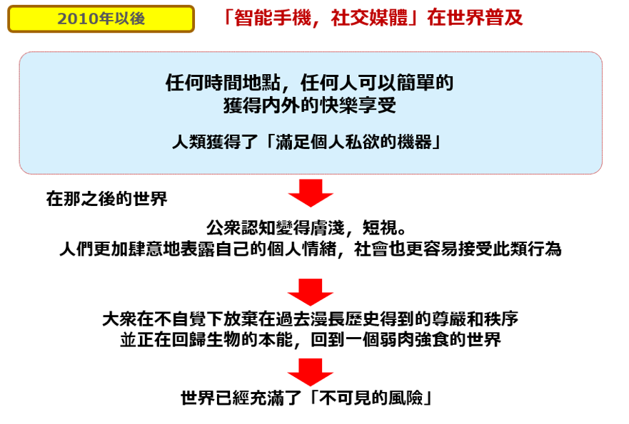 接下來,我將討論超長期視角的主題「不可見的風險」。自2010年左右開始全球普及的智能手機(包括SNS)可能對世界產生了極大的負面影響。