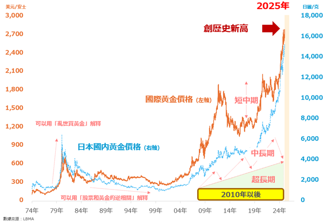 在過去的50年裡,黃金價格如下所示。1970年代後期,僅靠「亂世買黃金」就能解釋金價波動;1980年代到90年代,僅靠「股票與黃金價格的反向關係」亦能解釋金價波動。