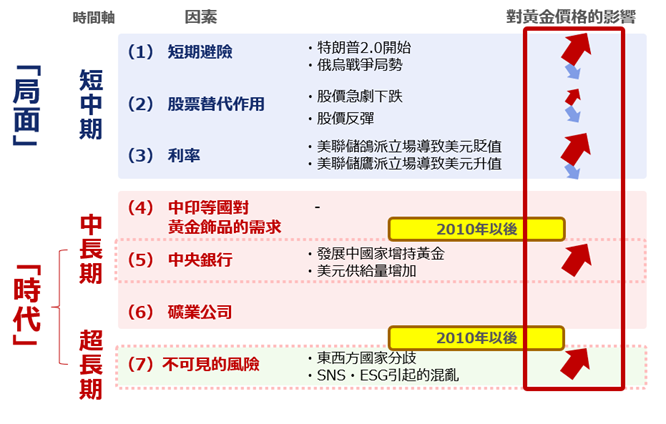 筆者所提出的七個因素對應如下。短期避險和利率整體上是上升的;股票的替代作用則有上升和下降兩種情況;中央銀行和不可見的風險則是上升的。