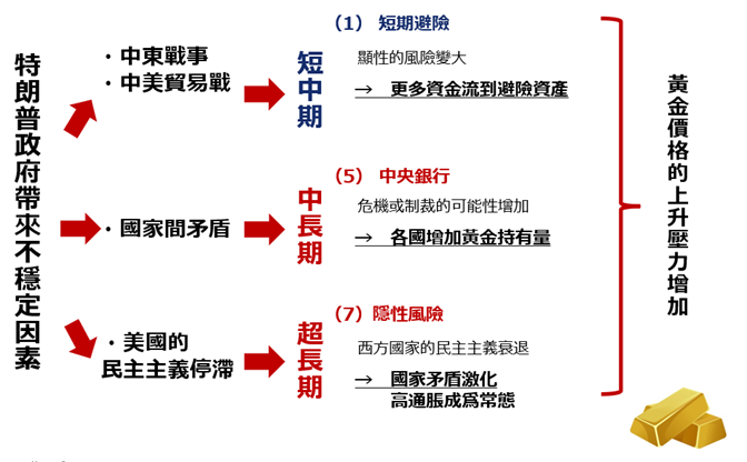 正如本報告所確認的,特朗普在短中期、中長期和超長期的時間軸上,同時帶來了不同的風險。儘管他有時會帶來股市上漲或美元走強等黃金的下跌壓力,但基本上作為「風險製造機」,他會持續對黃金市場施加上升壓力。