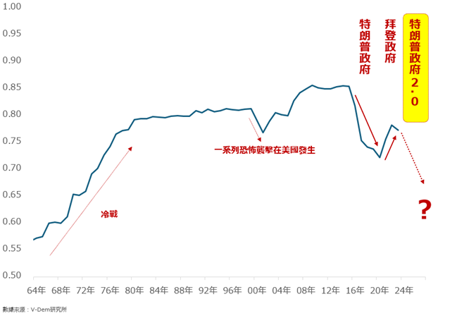 隨著特朗普2.0的開始,有一個指數可能會急劇下降。這便是由瑞典V-Dem研究所公布的美國自由民主指數。