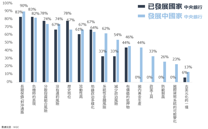 已發展國家和發展中國家的中央銀行都將黃金視為長期保值的手段、危機時能發揮作用的資產、沒有違約風險的資產等。此外,一些發展中國家的中央銀行還將黃金視為防備美國等已發展國“制裁”影響的手段。