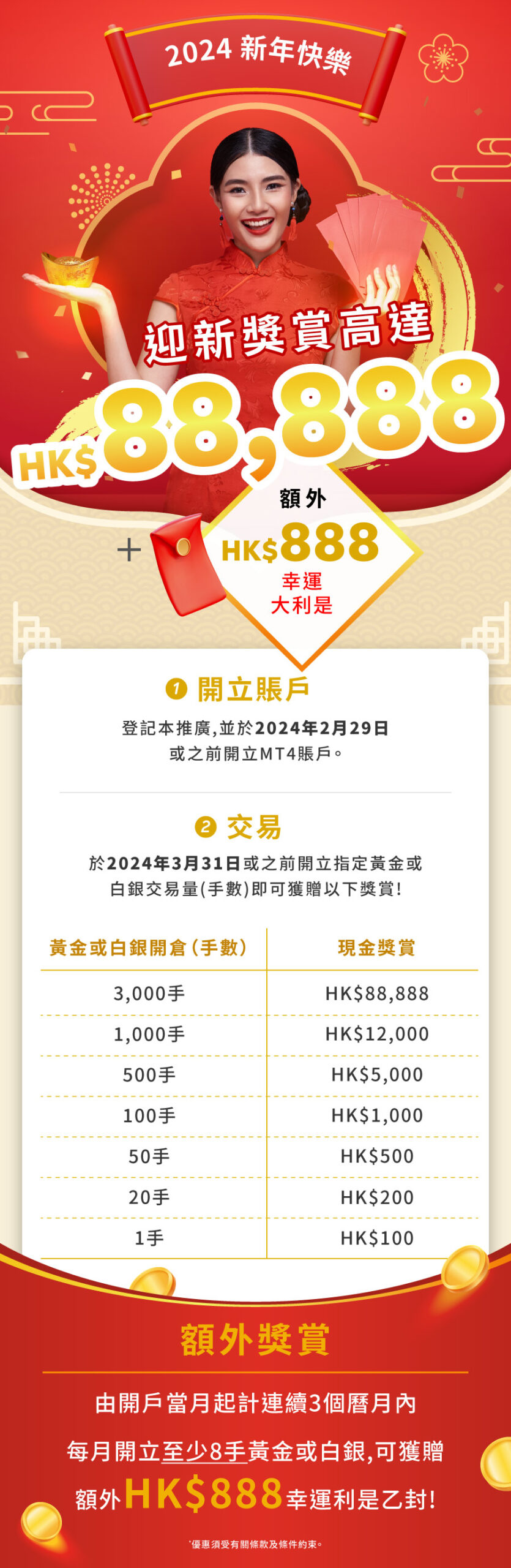 8. 由開戶當月起計連續3個曆月內每月開立8手或以上黃金(800盎士)或白銀(40,000盎士)之合資格客戶可獲贈額外HK$888現金回贈。