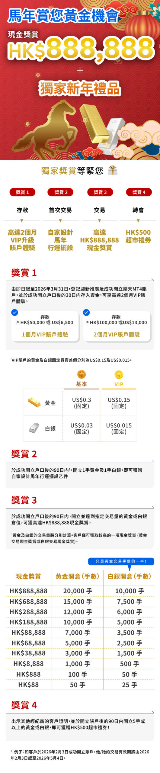 - 本推廣適用於2026年2月1日至2026年3月31日止 (香港時間) 內成功開立樂天MT4賬戶 (「開戶有效期」),且現未持有任何樂天MT4賬戶並於此推廣的開始日期前十二(12)個月內未曾取消任何樂天MT4賬戶之客戶 (「合資格客戶」)。