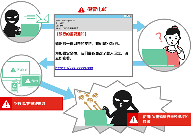 我收到一封疑似来自XX银行的电邮,内容为「由于我们加强了安全措施,请重新登入并重设您的用户资料。请按此重设资料,不便之处,敬请原谅」。因此,我毫不犹豫地按下电邮中的连结,并于其页面上输入了用户ID及密码。后来,有可疑人士利用我输入的资料在未经授权的情况下登入我的账户,进行了诈骗转账。