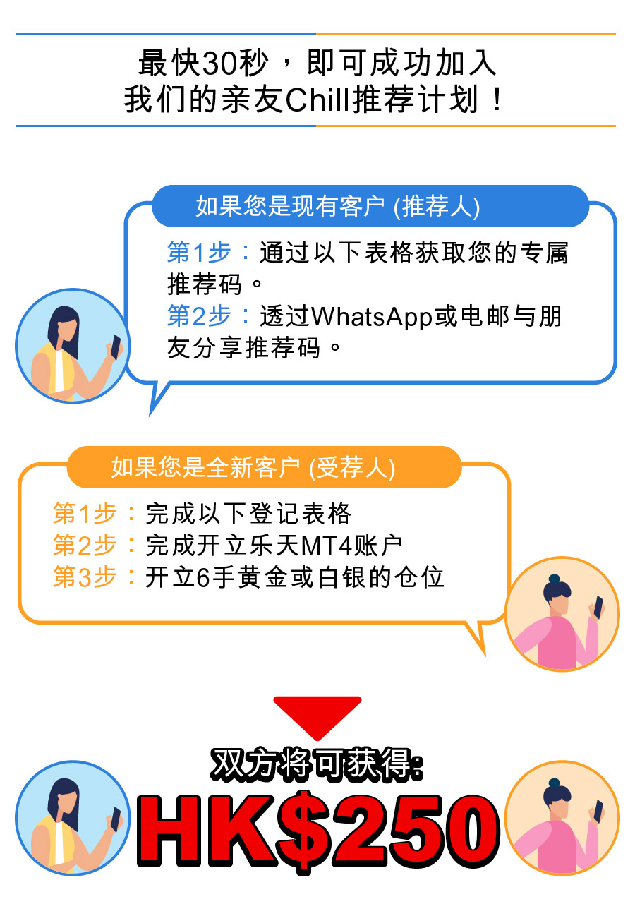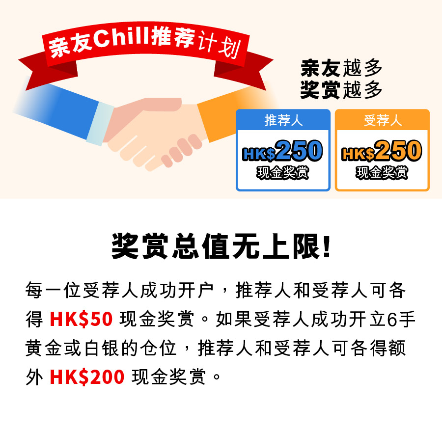 A. 乐天证券金业的亲友Chill 推荐计划目的是鼓励客户邀请更多家人朋友开立账户并进行交易!当受荐人成功使用推荐码开立账户时,推荐人和受荐人都可以获赠HK$50。而当受荐人成功开立6手黄金或白银的仓位时,推荐人和受荐人即可获赠额外HK$200。推荐奖赏是没有上限的。