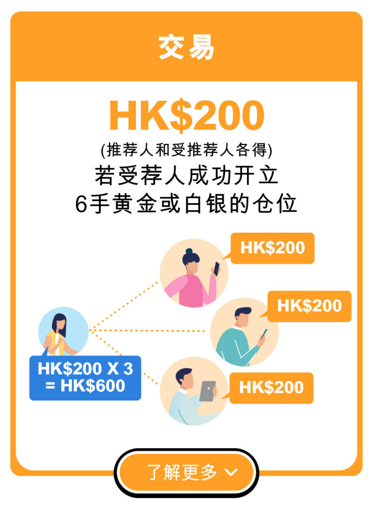 6. 受荐人必须在开户月份起至下个历月完结前,开立不少於600盎司黄金或30,000盎司白银的仓位,推荐人和受荐人方可各获赠HK$200现金奖赏。