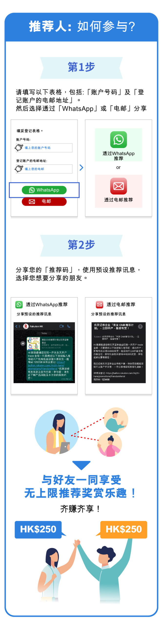 2. 推荐人必须为乐天证券金业的现有客户,并透过在指定计划的网页上完成登记表格,将自己的推荐代码分享给其他人(「推荐人」)。本公司职员均不能於此计划中成为推荐人。
