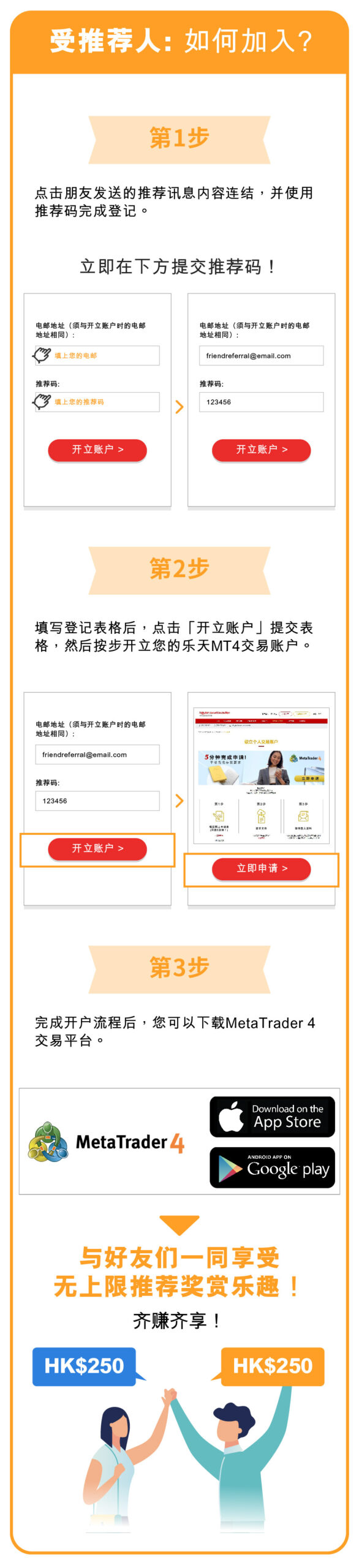 5. 受荐人必须在指定计划页面成功提交推荐人所提供的推荐代码,并成功开立乐天MT4账户,推荐人和受荐人方可各获赠HK$50现金奖赏。受荐人提交推荐代码时所使用的电邮应与开立账户时所使用的相同,否则将被视为放弃本推荐计划。