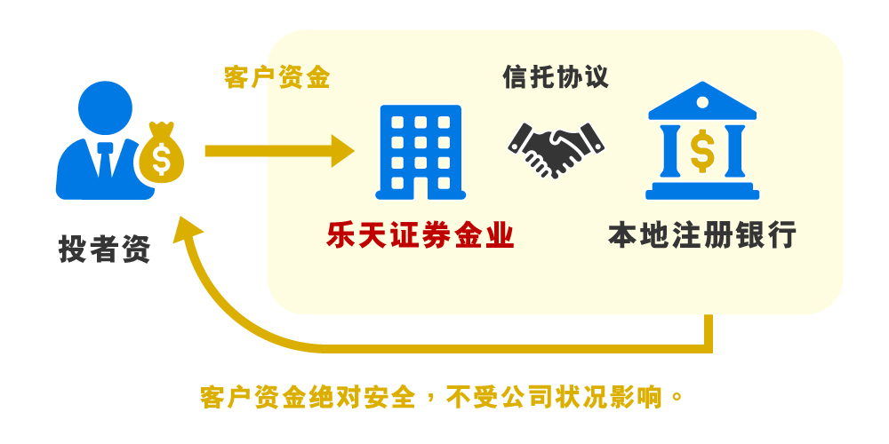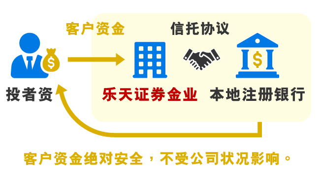 客户资金由本地注册银行的独立信托账户托管,与乐天证券金业自有资金隔离存放,确保客户资金绝对安全,不受公司状况影响。